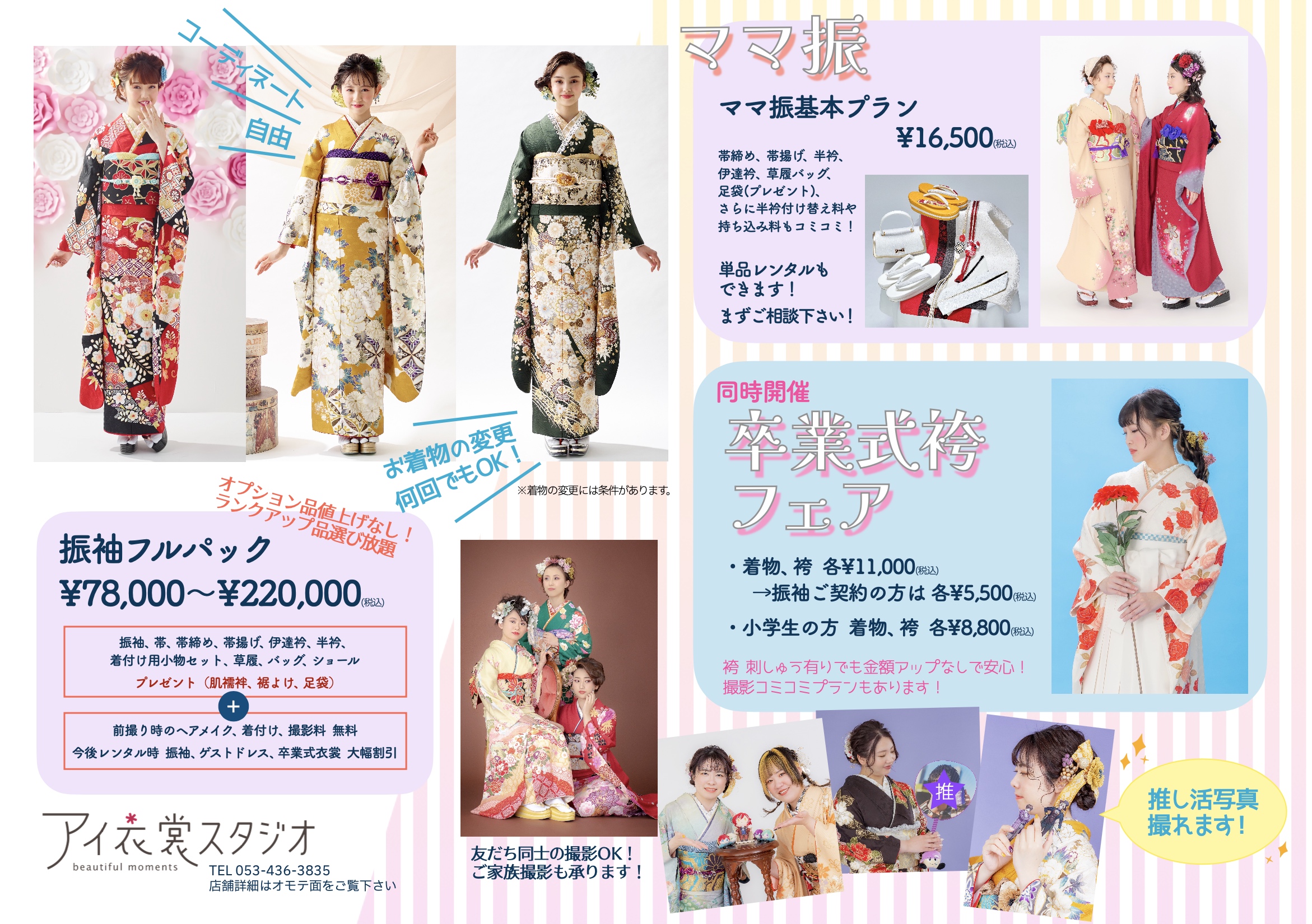振袖は、ご契約後何回でも変更が可能です(はたちの集いの3ヶ月前まで。前撮り前なら原則として無料です)。