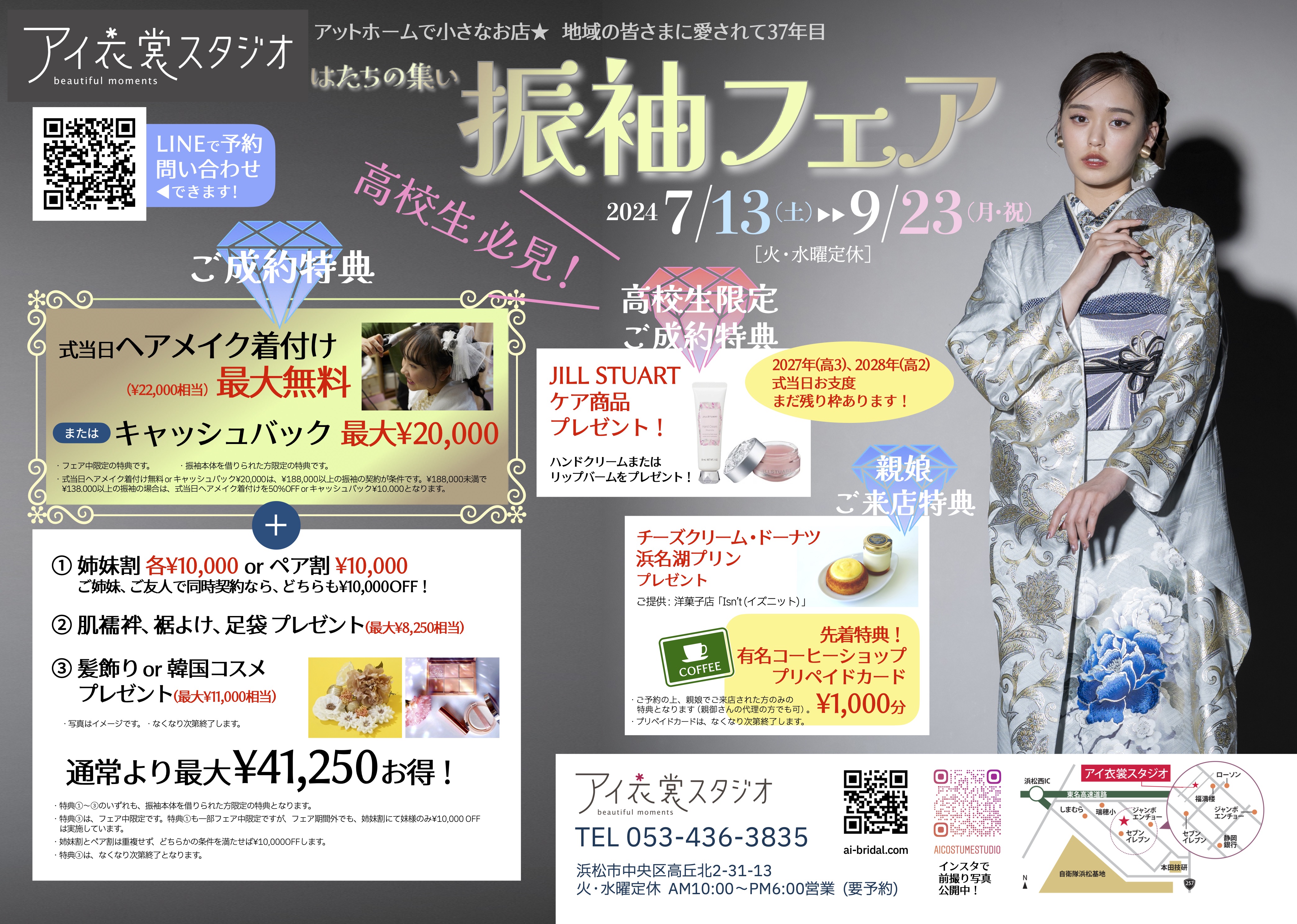 - ¥188,000以上の振袖をご契約で、式当日ヘアメイク着付けプレゼント(¥22,000相当) or キャッシュバック¥20,000!